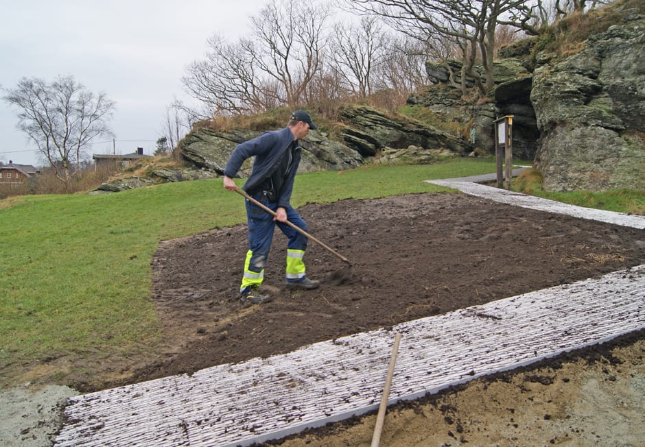 Thomas Aase, Randaberg kommune ferdigstiller arronderingen av stien. Den ferske gresstorven gjør at stien sklir naturlig inn i landskapet med en gang, selv om ristene syner ennå. Foto: Flemming Krøger Rogaland fylkeskommune.